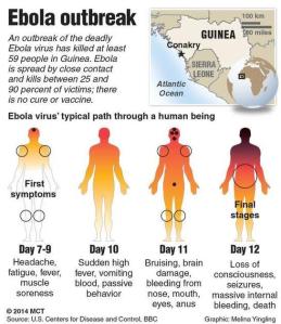 Ebola is an infectious disease which is categorized by fever and severe internal bleeding. The symptoms include fever, fatigue, headache, muscle pain, sore throat which is followed by vomiting, diarrhea, rash, internal and external bleeding and organ failures.